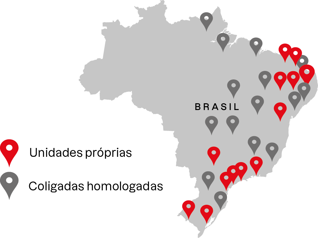 Atuamos nas principais capitais através de unidades próprias (já estamos instalados em São Paulo (Capital), Campinas/SP, Porto Alegre/RS, Caxias do Sul/RS, Recife/PE, Jaboatão dos Guararapes/PE e Salvador/BA, Fortaleza, Eusebio) e uma rede de coligadas homologadas.